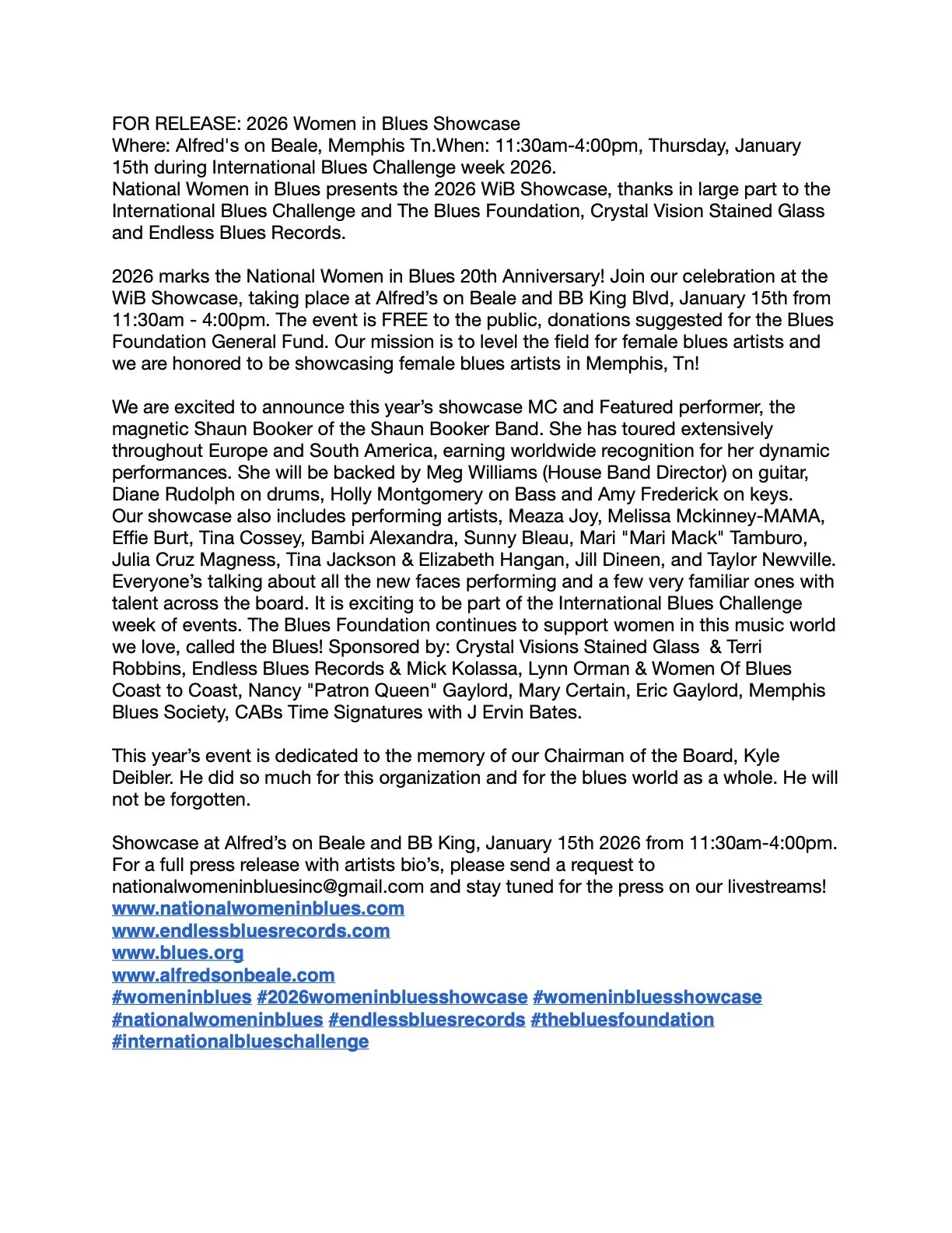 National Women in Blues and Endless Blues Records present the 2025 WiB Showcase, thanks in large part to the International Blues Challenge and The Blues Foundation.